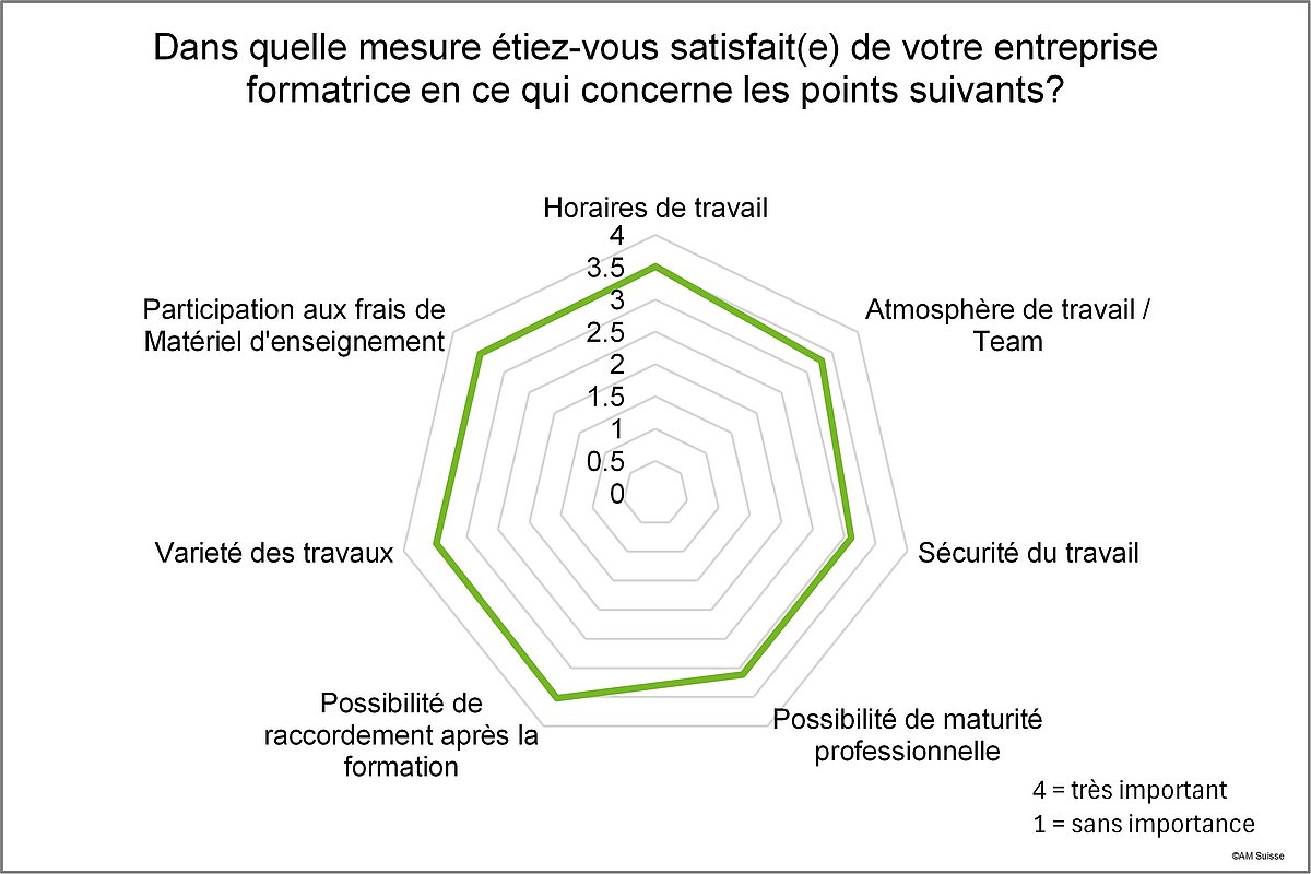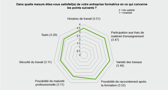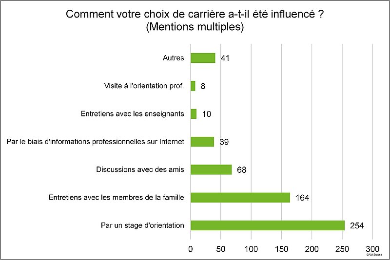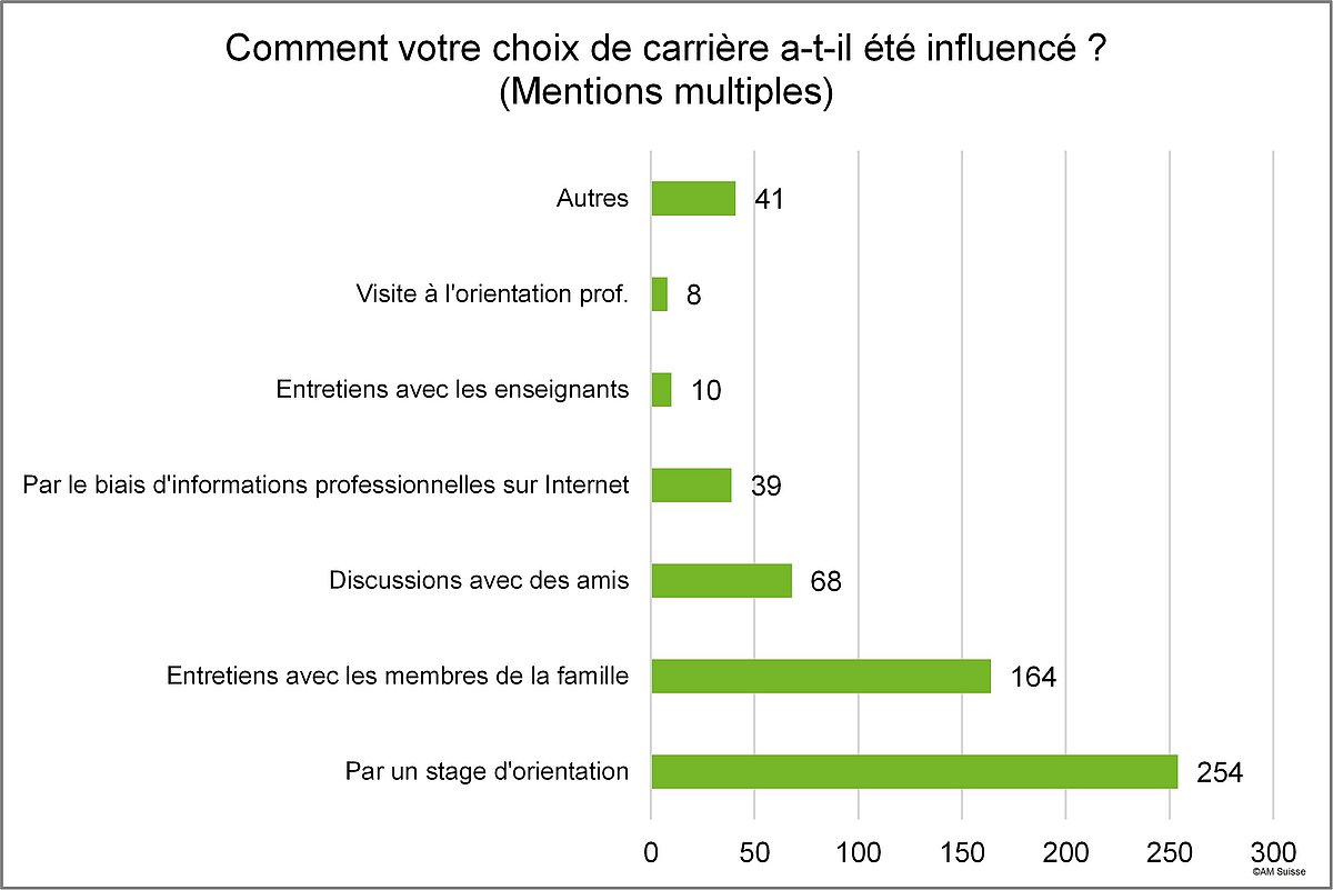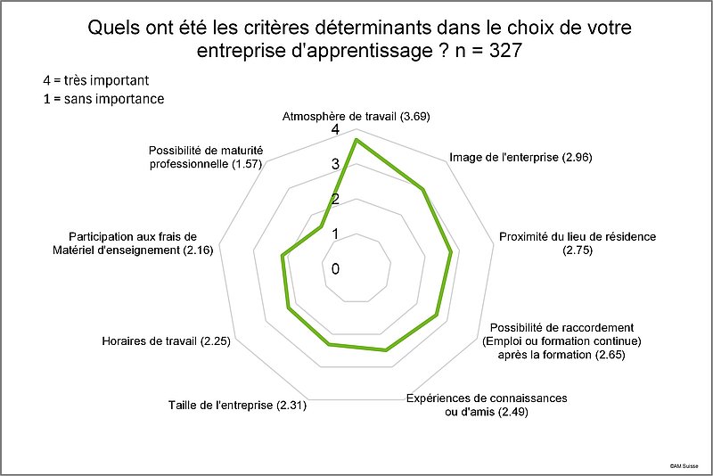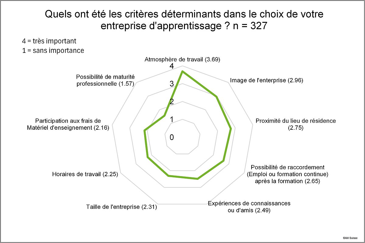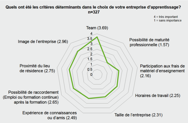e choix d’un métier fait l’objet de nombreuses discussions au sein. de la famille, avec les proches et les connaissances. Après le stage de pré-apprentissage, il s’agit du deuxième facteur d’influence dans le choix de la profession. L’enquête montre une fois de plus l’importance de l’équipe et de l’environnement social au travail. Les expériences positives pendant le stage de préapprentissage s’avèrent particulièrement importantes. Lors du choix de l’employeur, les futurs professionnel(le)s accordent une très grande importance au facteur humain et aux collègues de travail. La moyenne est ici de 3,69, sachant que quatre points correspondent à la mention « très satisfait ». Viennent ensuite l’image de l’entreprise et la proximité du domicile. La question relative aux possibilités de passerelle, qui obtient la valeur moyenne de 2,65 points, mérite également d’être mentionnée. Ce résultat montre que les jeunes professionnel(le)s réfléchissent très tôt à leur évolution professionnelle.