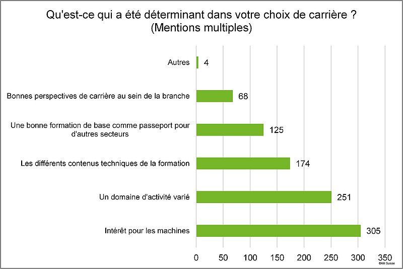 L’enquête menée par Agrotec Suisse brosse une nouvelle fois un tableau complet de l’état d’esprit des personnes suivant une formation pour obtenir un CFC de mécanicien(ne) en machines agricoles, mécanicien(ne) en machines de chantier et mécanicien(ne) d’appareils à moteur. 327 apprenti(e)s de quatrième année ont participé à l’enquête de cette année, soit 76,4 % des apprenti(e)s sur le point de se soumettre à la PQ. Cette année encore, les résultats ont été très positifs. Les apprenti(e)s ont fourni des informations sur les facteurs influençant le choix professionnel et sur leurs attentes vis-à-vis de l’entreprise formatrice et de la formation elle-même. Au cours de la deuxième moitié de leur apprentissage, les jeunes professionnel(le)s réfléchissent déjà à ce qu’ils feront après leur formation. Les relations interpersonnelles représentent un facteur très important pour les jeunes, qui a un grand impact sur le choix final de l’entreprise formatrice.